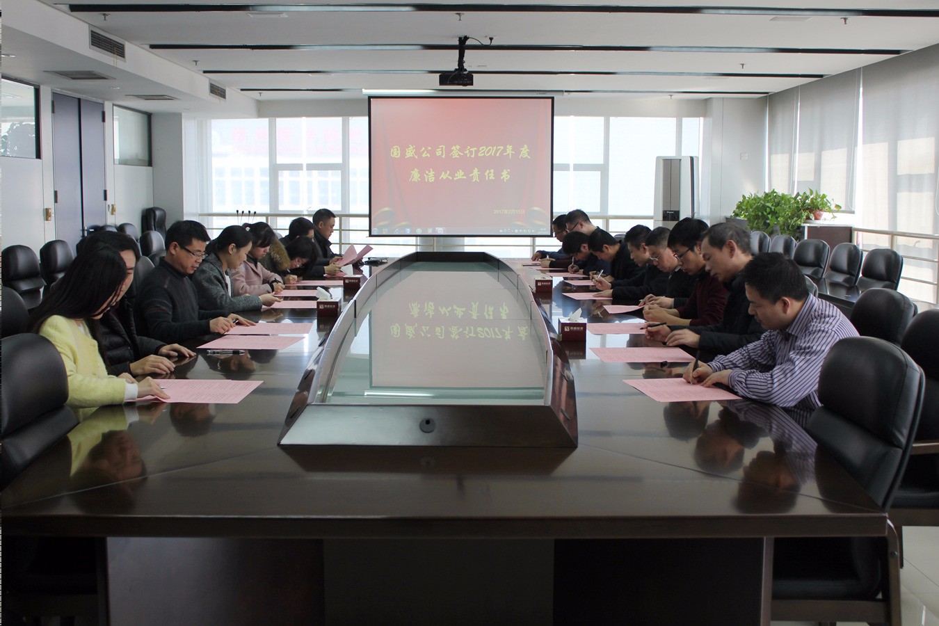 为进一步强化反腐倡廉建设,引导公司干部职工正确对待和行使手中的权利,不断提高廉洁自律意识,国盛公司结合实际情况,制定廉洁从业责任书。公司董事长赵丽、总经理李中亚、副总经理宋超等高管,中层管理人员及重点岗位人员于2月15日签订了责任书。