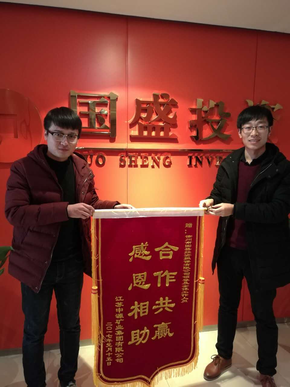 1月25日,国盛公司收到江苏中源矿业集团有限公司赠送的锦旗与感谢信,对国盛公司给予的应急周转资金支持表示真诚地感谢。