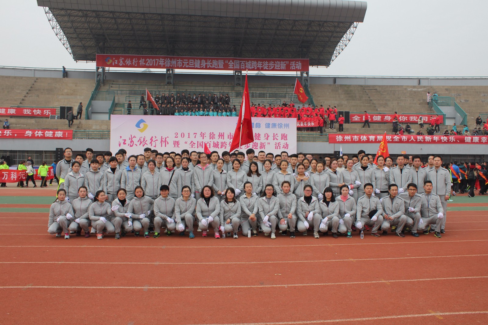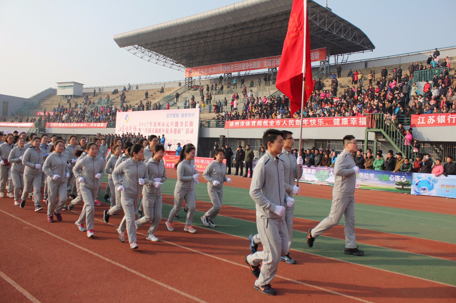 1月1日上午9点,2017年徐州市元旦健身长跑暨“全国百城跨年徒步迎新”活动在徐州市体育中心田径场拉开帷幕。为积极响应徐州市委、市政府的号召,国盛公司组织了100人的方队参加此次元旦长跑活动。